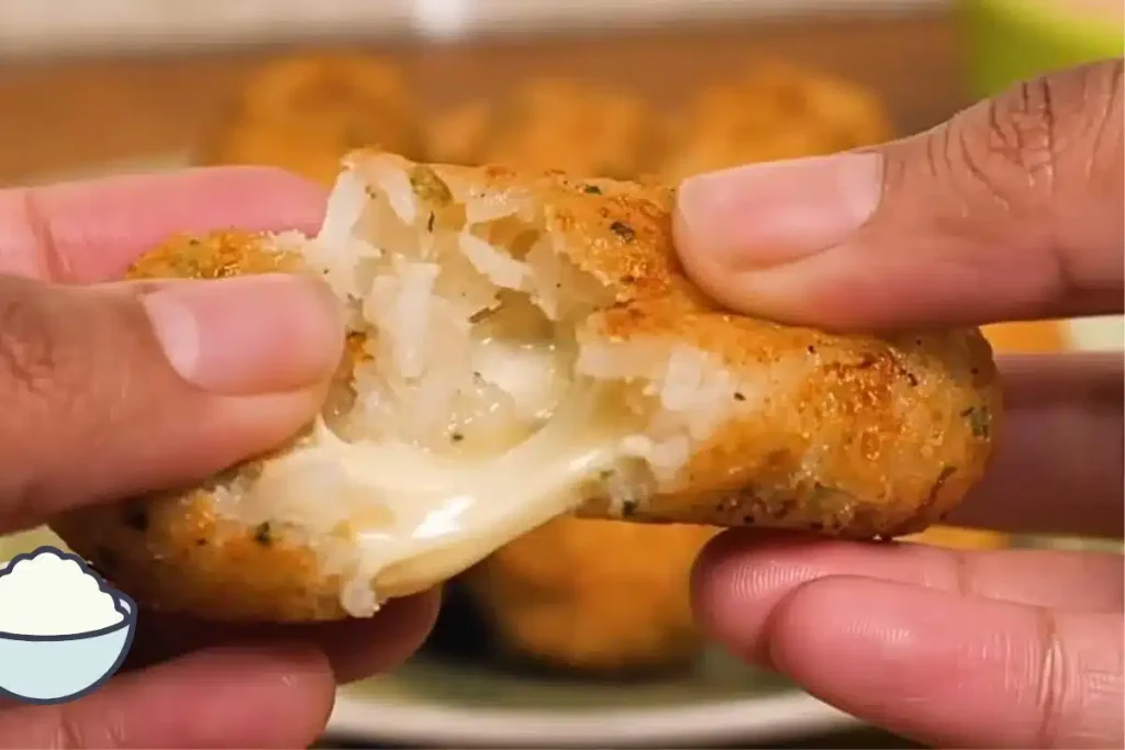 - Em uma vasilha, misture o arroz cozido, os ovos inteiros, o amido de milho, o queijo parmesão ralado, o leite integral, a farinha de trigo, o cheiro-verde picado e o fermento em pó, até obter uma massa uniforme;